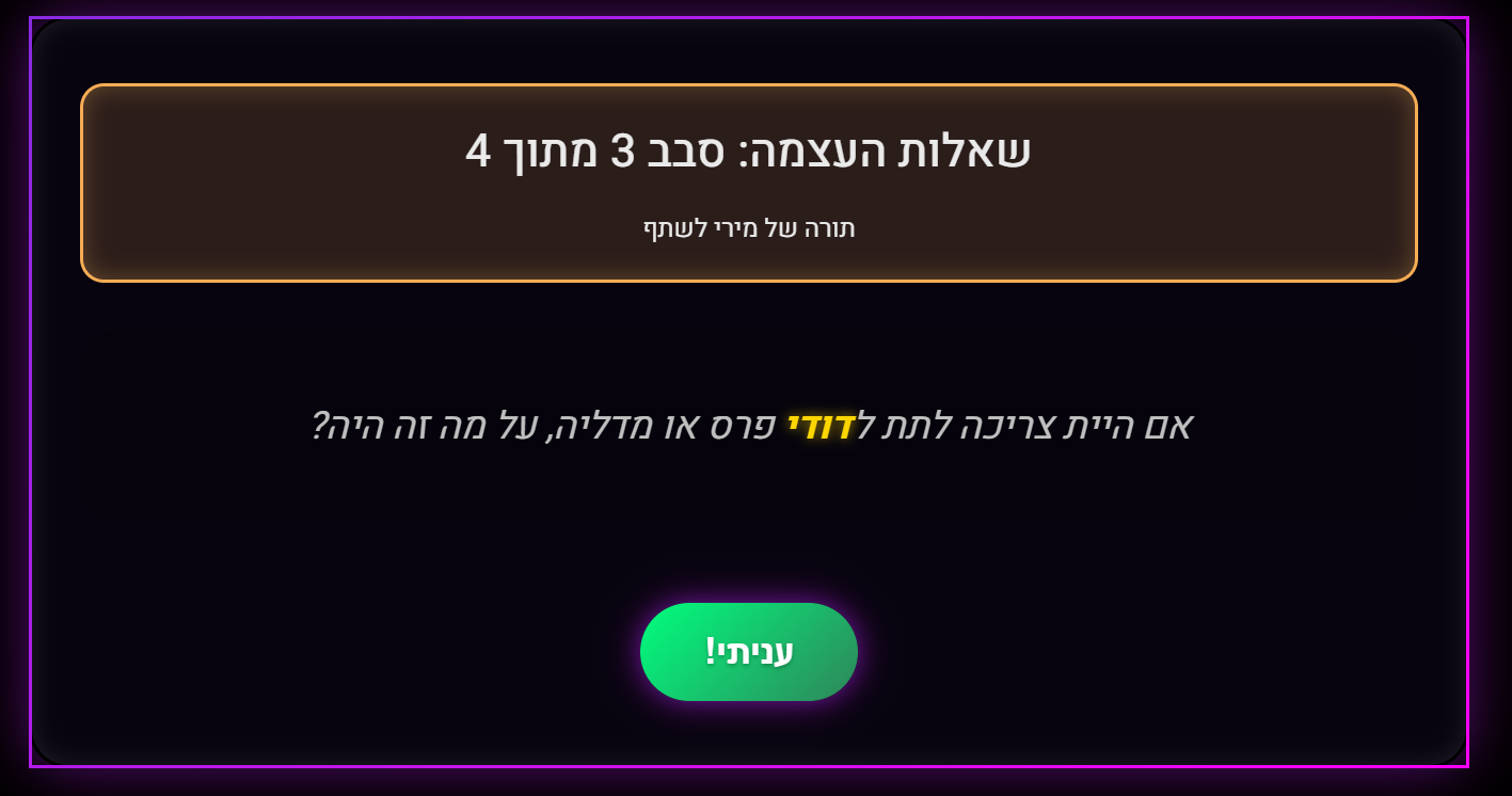 כל אחד עונה בתורו על שאלות שמכוונות לעומק, רגש, וזיכרונות אישיים.